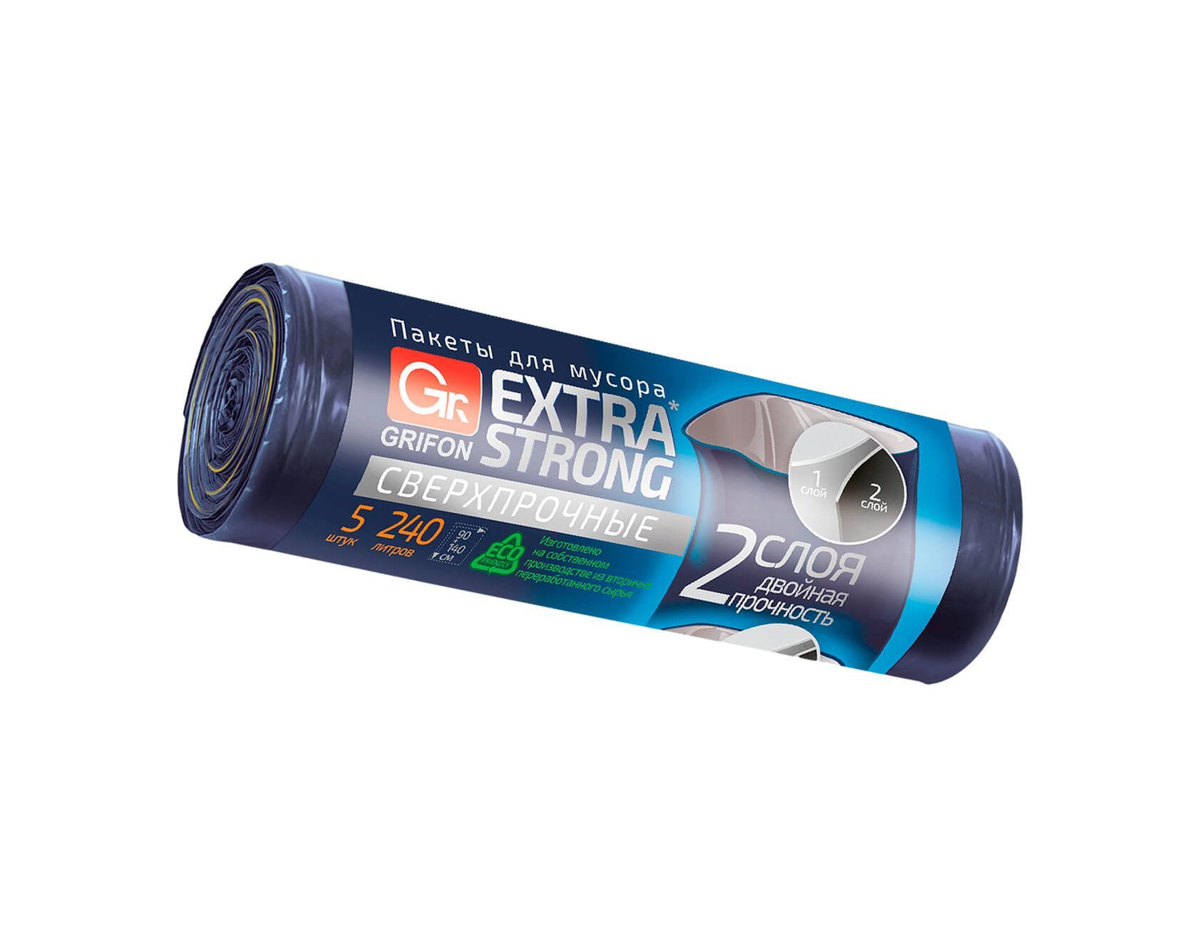 Мешки для мусора 240 л, двухслойные, синие, в рулоне 5 шт., ПВД 50 мкм, 1400х900 мм, GRIFON EXTRA STRONG, 101-078