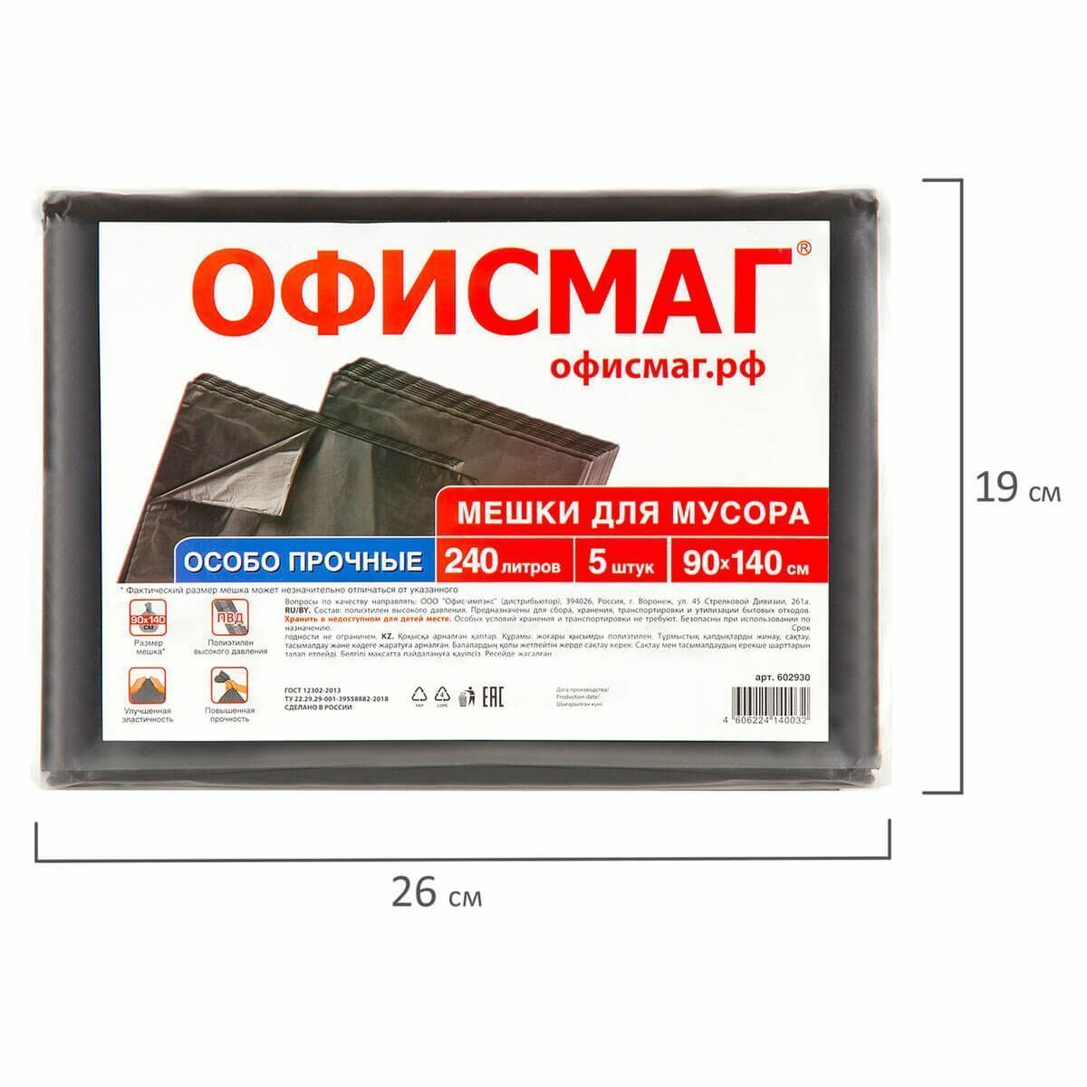 Мешки для мусора 240 л, черные, в пачке 5 шт., ПВД 60 мкм, 1400х900 мм, Офисмаг, 602930