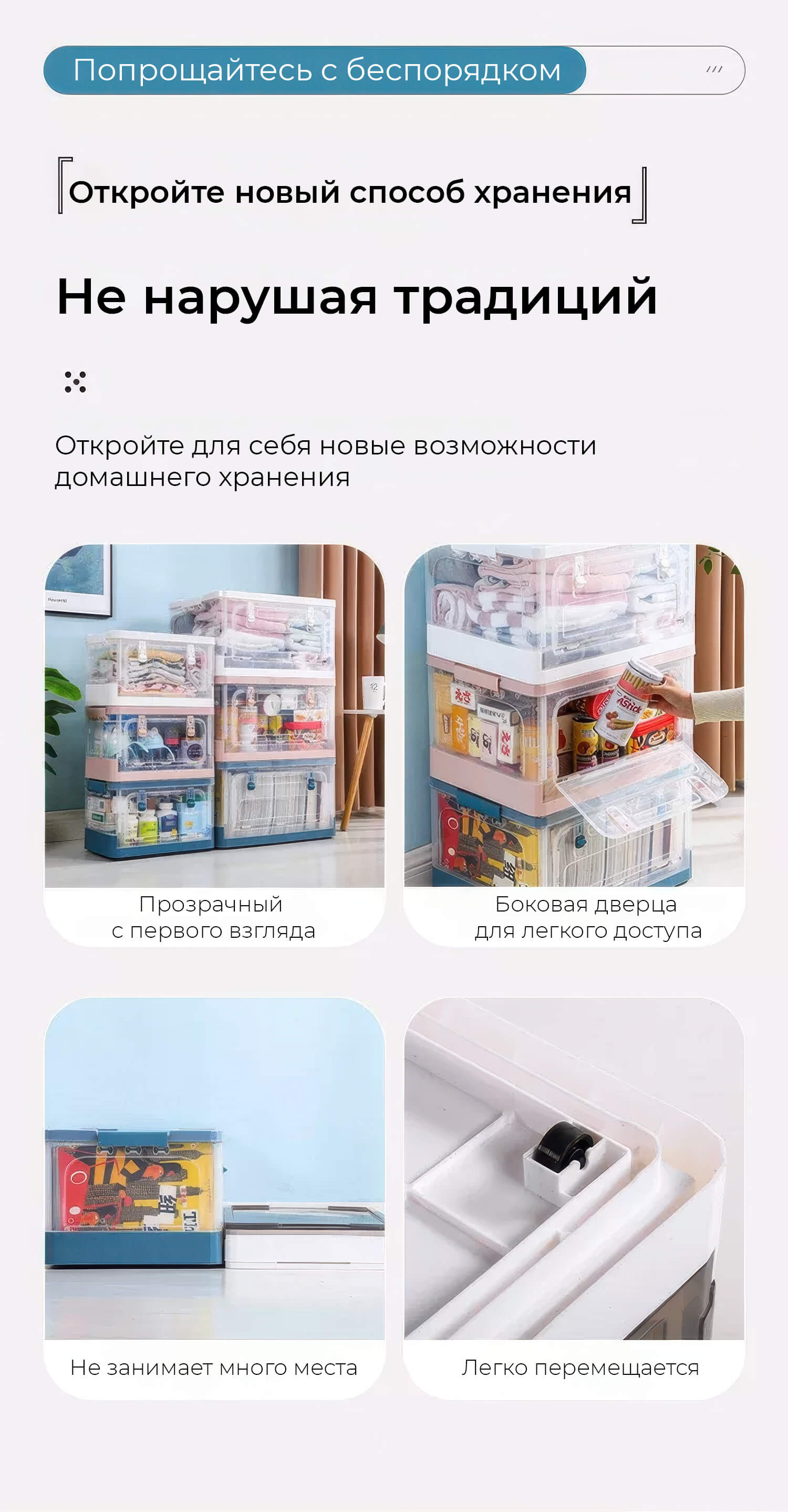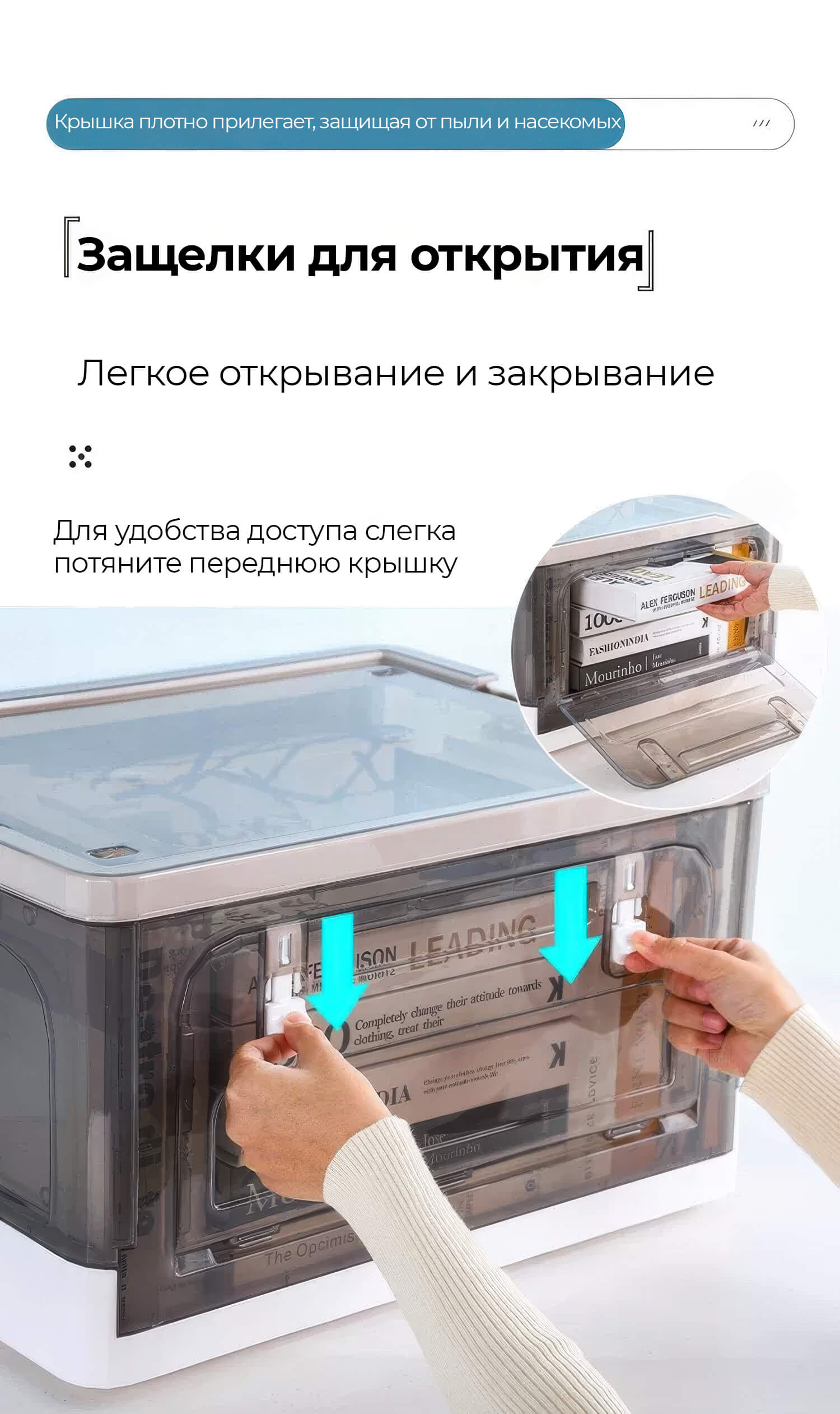 Пластиковая коробка с крышкой защищает вещи от пыли и влаги, а прочная конструкция обеспечивает долговечность даже при активном использовании. Колесики делают перемещение легким и удобным, а встроенная дверца на боковой стенке позволяет быстро получить доступ к содержимому, не снимая крышку. Складная конструкция экономит пространство, когда контейнер не используется.