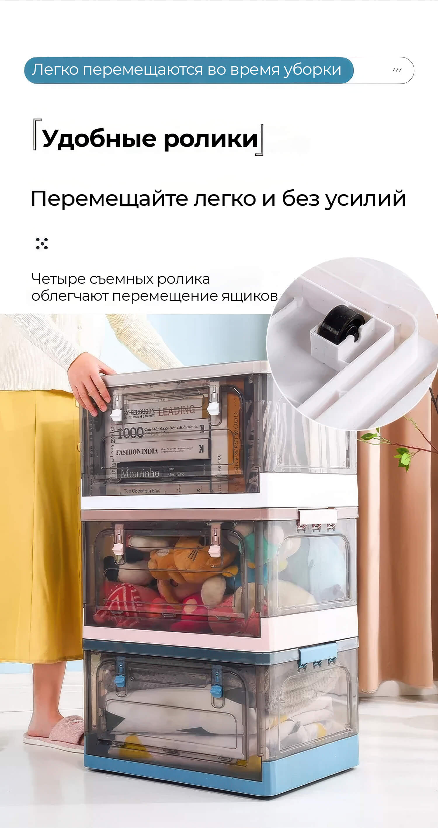 Пластиковая коробка с крышкой надежно защищает вещи от пыли и влаги, сохраняя их в чистоте. Прочная конструкция выдерживает нагрузку, а колесики обеспечивают легкость передвижения. Благодаря складной конструкции ящик удобно хранить, когда он не используется.
