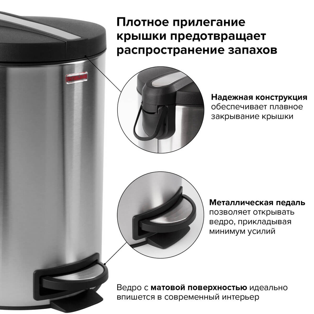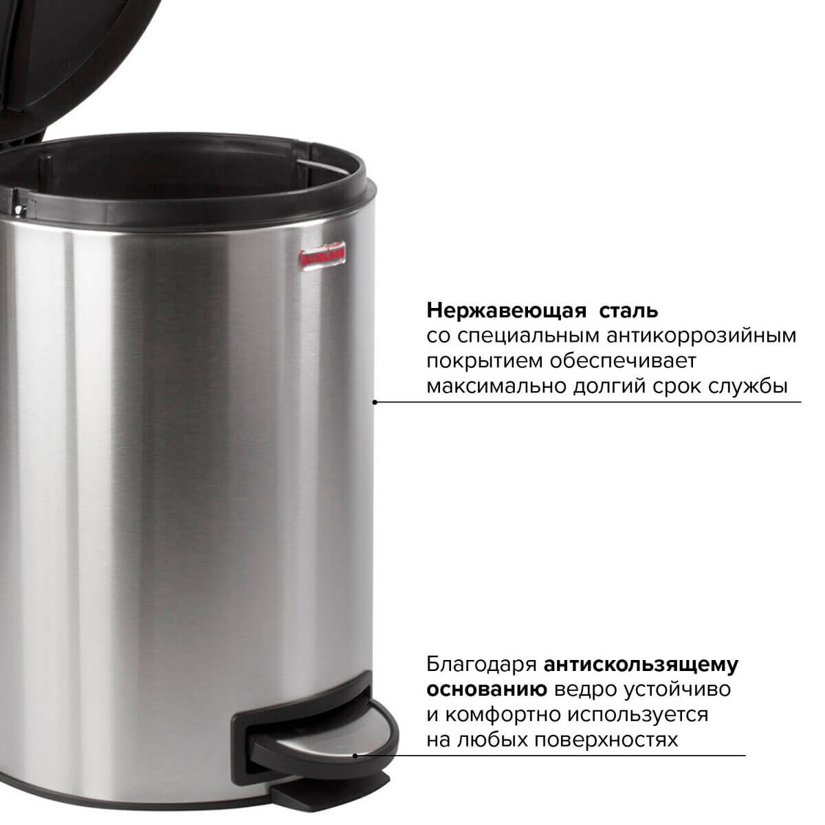 Изготовленное из нержавеющей стали с матовым покрытием, ведро обладает современным внешним видом. Антискользящее основание придает устойчивость. Рекомендуемый объем мешка - 20 литров.
